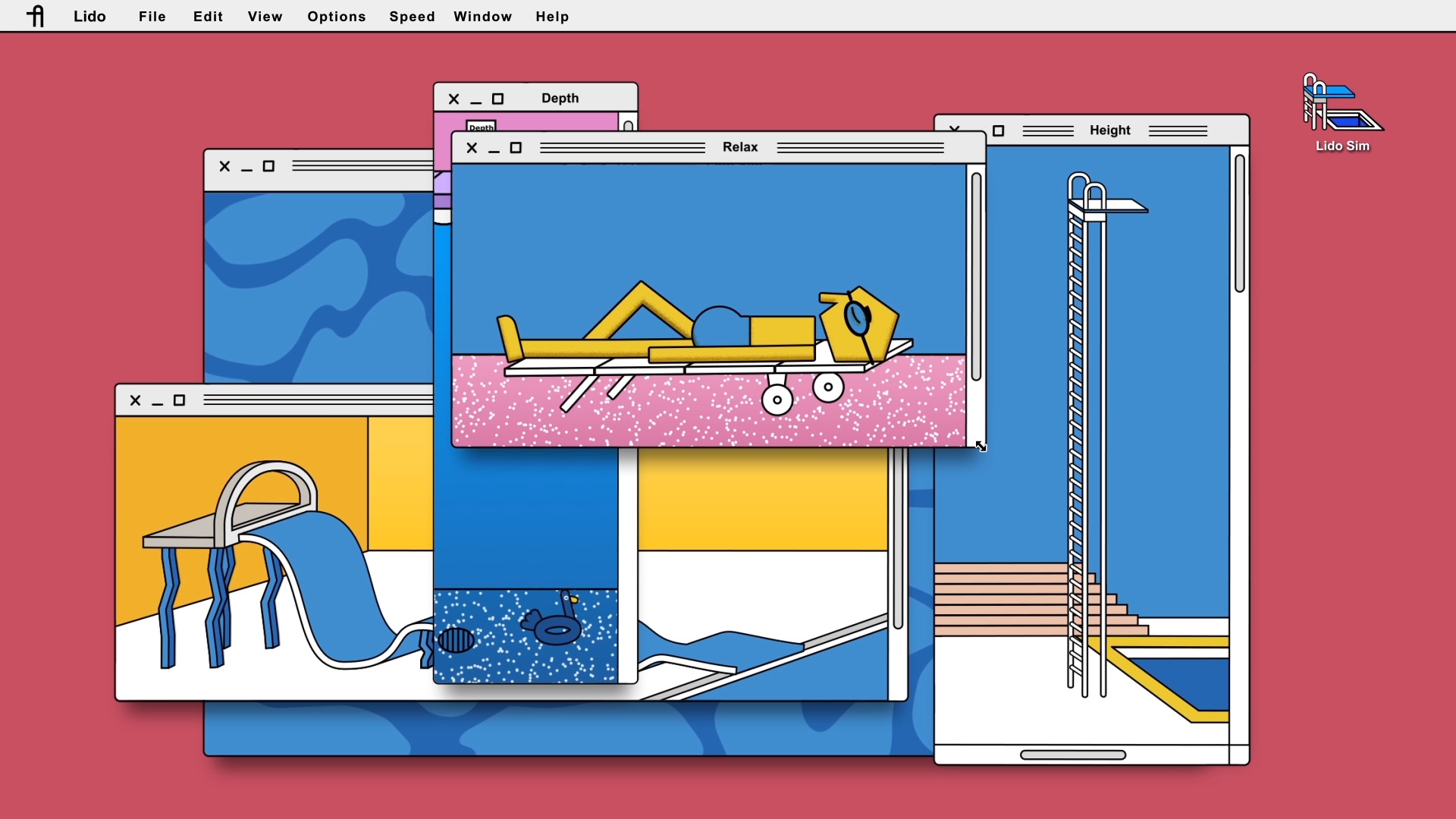 The goggle-wearing figure's attempts to nonchalantly mooch about by the poolside are consistently thwarted by an invisible computer-user, who takes on a mischievously god-like persona as he uses the mechanics of screen windows to stretch and distort the character's surroundings.
